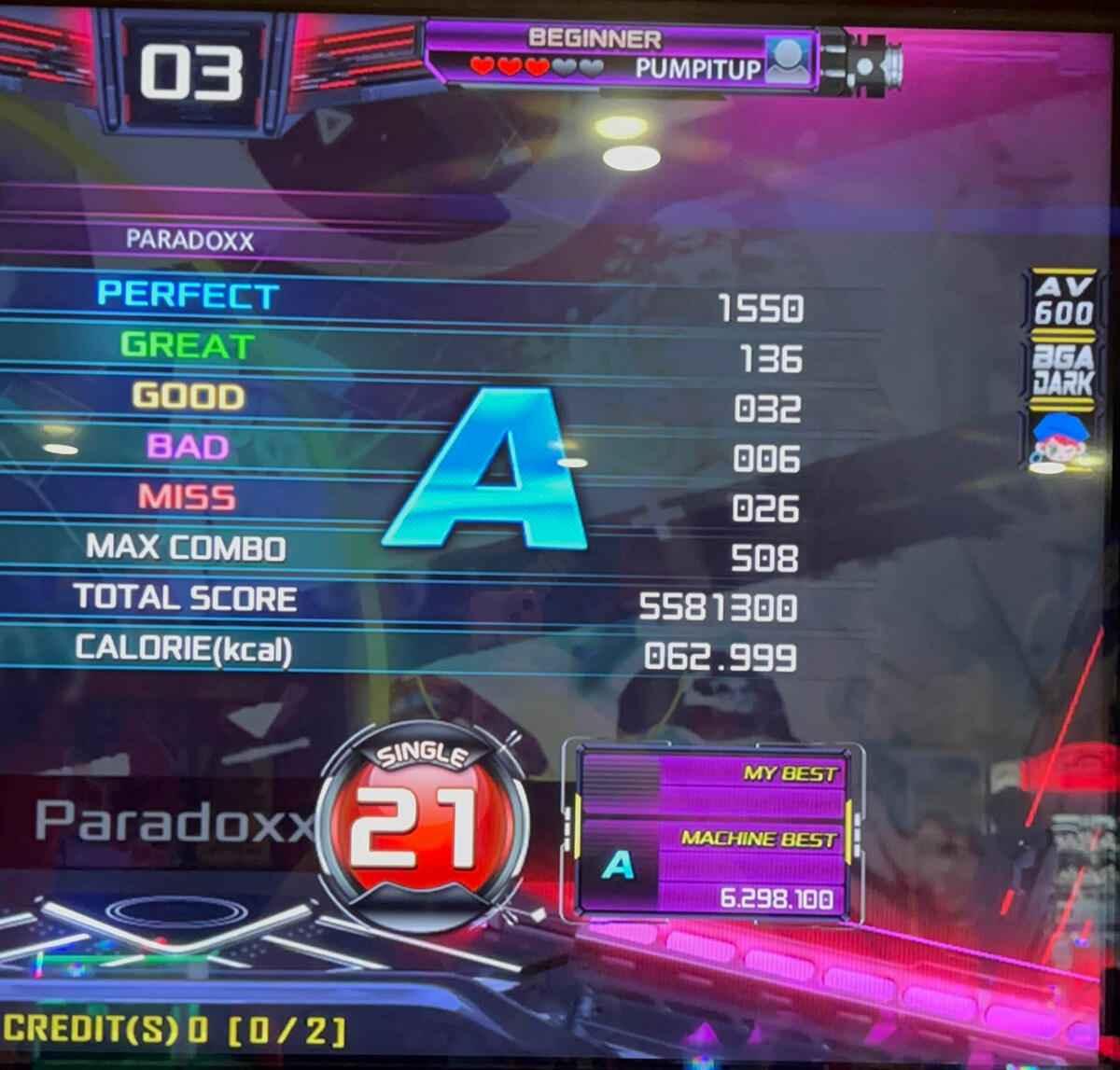 as of now, my last and only goal is to pass paradoxx s20, which i have not passed yet. i've gotten a few broken As, but that's about it. pump it up is a great game. gets me exercising, and i managed to prove to myself and many people that i am not a weak girl. i also did not let hrt pull me down, as i pushed myself to get gargoyle full s21 and 86 full d23. i've made many friends here, and i wish for many more awesome memories from this game, and the community.